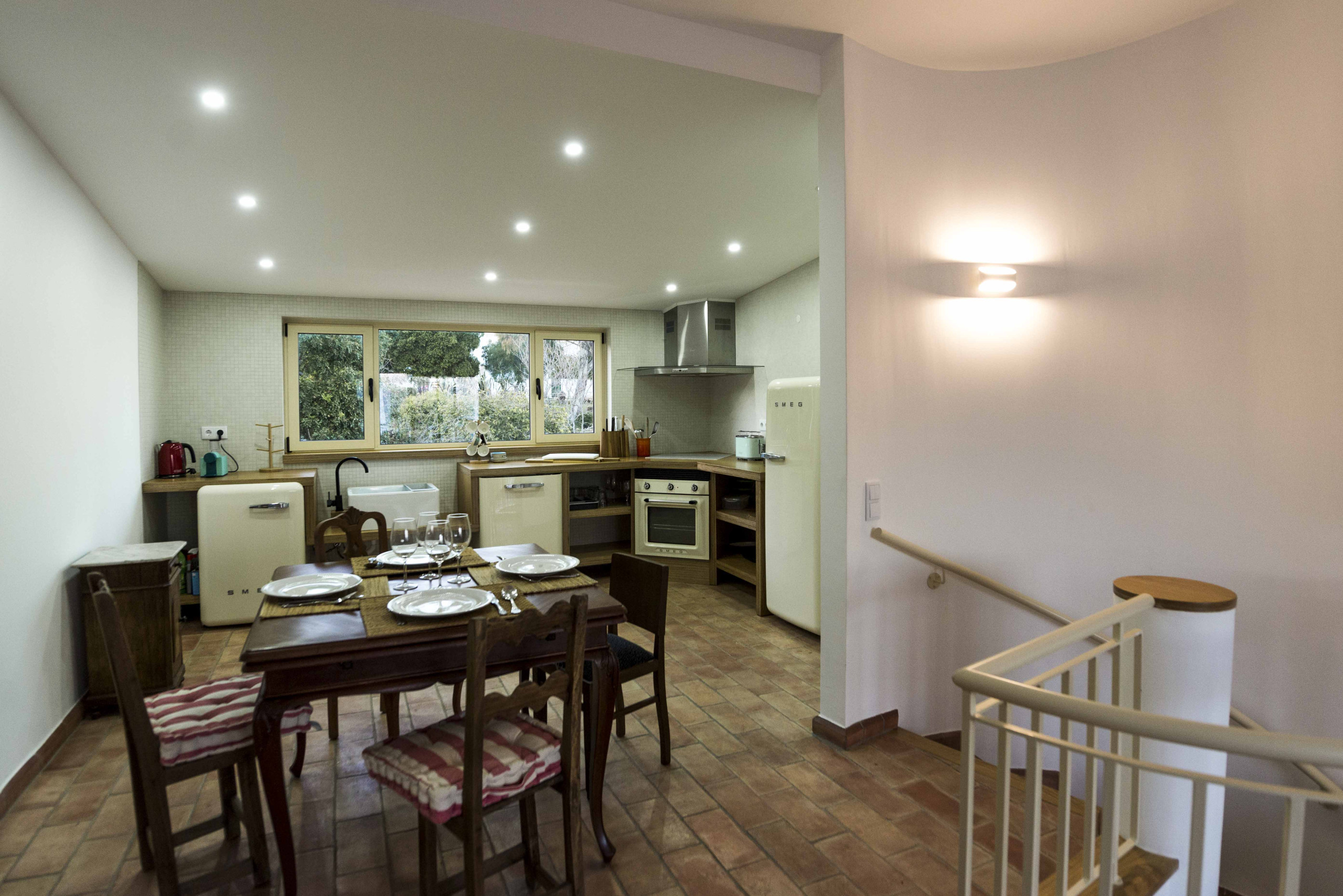O acesso à sala de estar/jantar é feito por escadas em caracol, muito típicas da área, onde desfrutará de uma esplêndida vista para o mar, aqui terá acesso a uma varanda, onde poderá desfrutar das suas refeições ao pôr do sol. Na cozinha encontrará tudo o que precisa para as suas férias, estando equipada com máquina de lavar roupa e máquina de lavar louça.